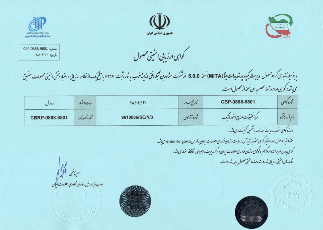 نسخه ۵ محصول سیستم مدیریت یکپارچه تهدیدات امنیتی میتا موفق به اخذ گواهینامه ارزیابی امنیتی با سطح انطباق EAL1 از سازمان فناوری اطلاعات گردید .